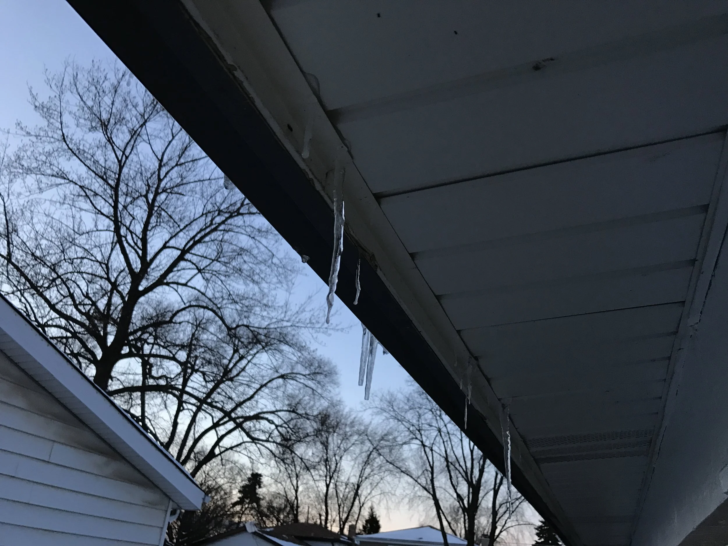 As can be seen in this example, ice damming has cause liquid water to make it's way through the fascia / soffit where it then froze.